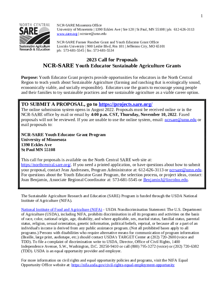 Filling out the NCR-SARE Youth Educator Sustainable Form requires careful preparation and attention to detail. Begin by gathering all the required information, such as project objectives, target beneficiaries, and your organization’s background. Understanding the grant criteria is essential, as it ensures that your proposal aligns with the funding goals of the program.