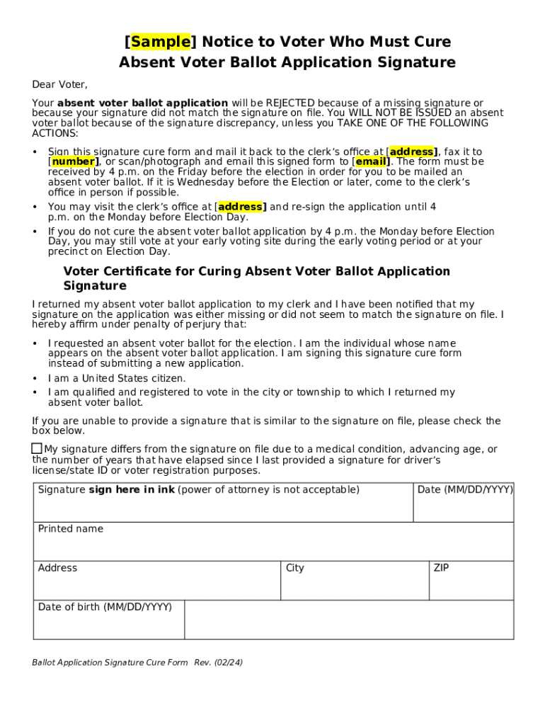Instructions for the form Notice to Voter Who Must Cure Absent Voter Ballot Application Signature
