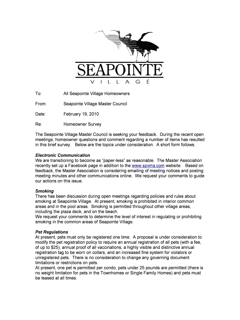 To: All Reappointed Village Homeowners From: Reappointed Village Master Council Date: February 19, 2010, Re: Homeowner Survey The Reappointed Village Master Council is seeking your feedback. During
