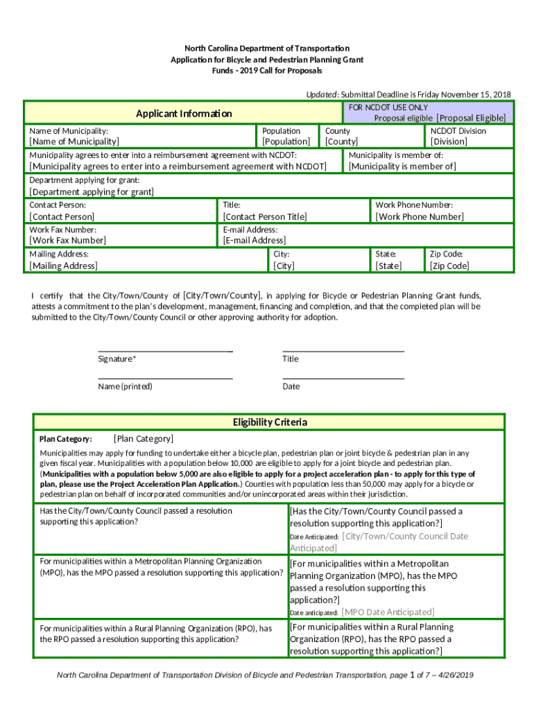 North Carolina Department of Transportation Application for Bicycle and Pedestrian Planning Grant Funds - 2019 Call for Proposals template instructions