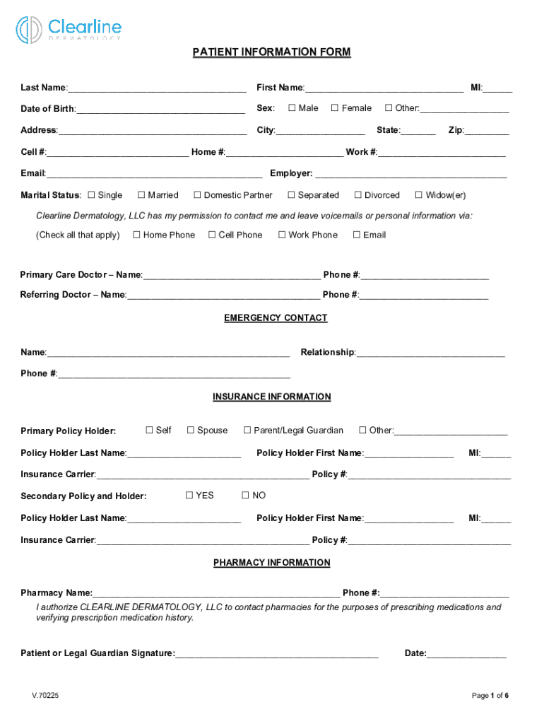 A comprehensive form that collects personal, insurance, medical history, and consent information from patients at Clearline Dermatology, LLC.