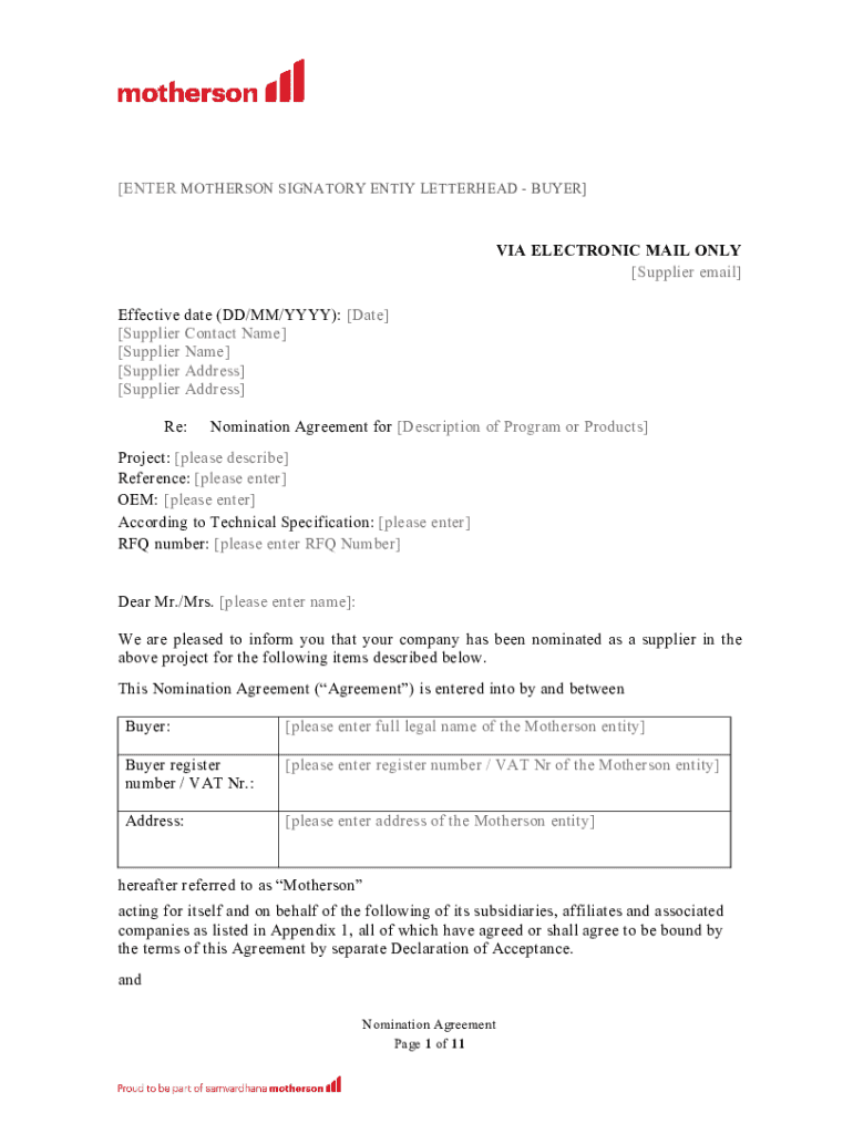 Get the free Nomination Agreement