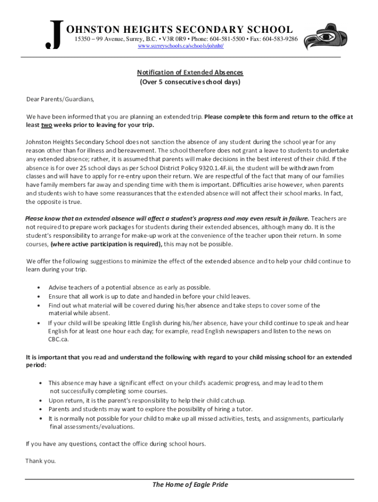 This document serves as a notification form for parents/guardians to inform Johnston Heights Secondary School about an extended absence of their child for more than 5 consecutive school days. It outlines