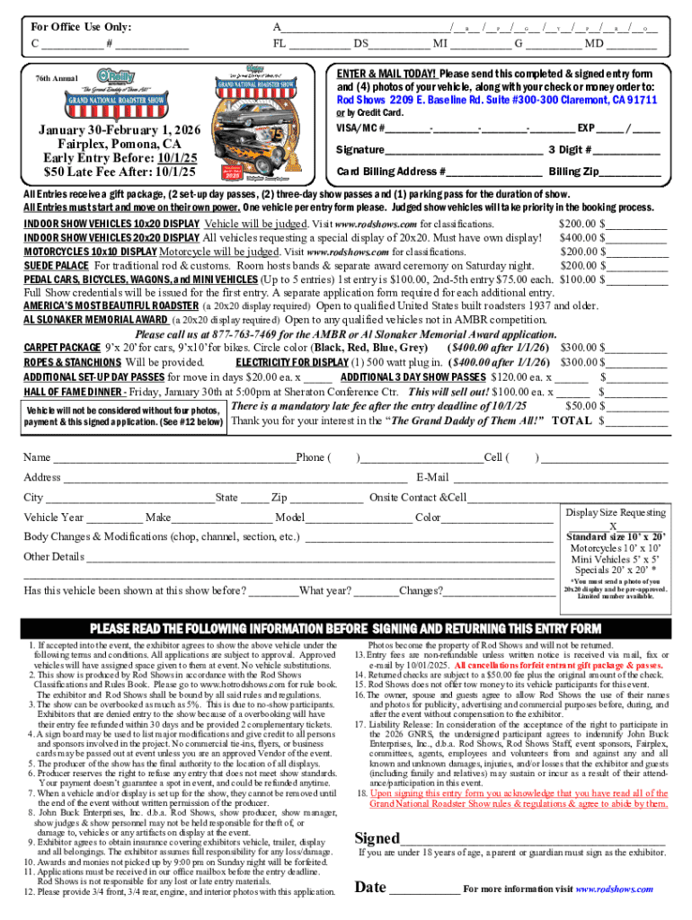 This document is an entry form for exhibitors wishing to participate in the 2026 Grand National Roadster Show, outlining registration details, fees, vehicle classifications, display requirements,