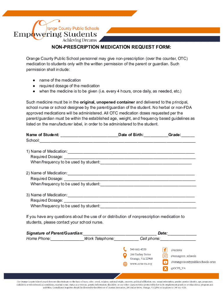 This form is used by Orange County Public School personnel to obtain written permission from a parent or guardian for administering nonprescription (over the counter) medication to students.