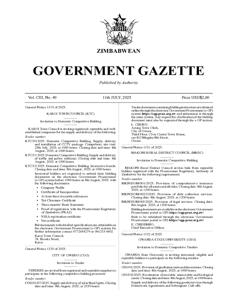 The Zimbabwean Government Gazette is an official publication containing government announcements, legal notices, and other essential documents. It serves as a vital communication tool that informs citizens, businesses, and various stakeholders about changes in regulations, new legislation, and significant public information. The Gazette not only facilitates transparency in government operations but also provides a record of decisions that may affect individuals and entities across the country.