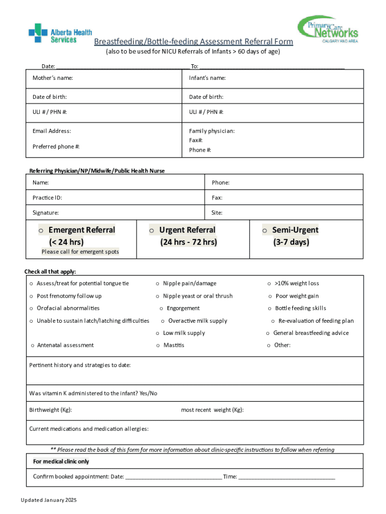 The breastfeeding/bottle-feeding assessment referral form serves a crucial function in the healthcare system, particularly in pediatrics. Its primary purpose is to facilitate a structured assessment of an infant's feeding methods, ensuring that healthcare professionals can effectively support both breastfeeding and bottle-feeding practices. A well-structured referral form streamlines the process of addressing feeding issues, allowing for timely interventions and appropriate care management.