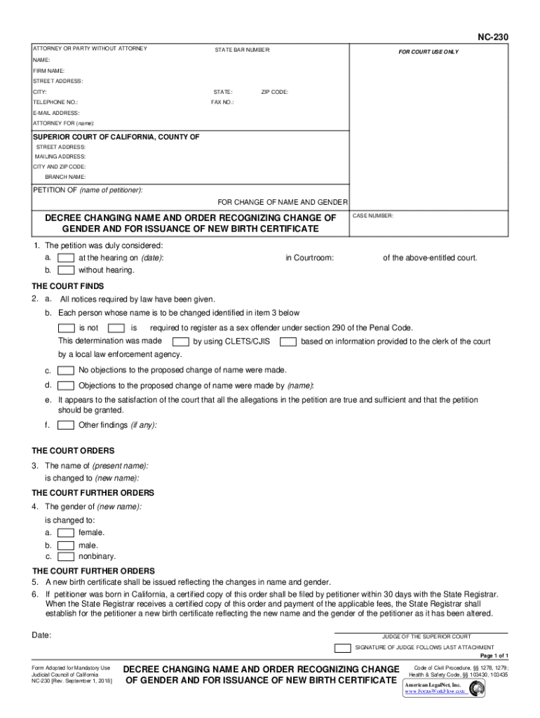 Understanding the purpose and importance of the NC-230 Form is essential, particularly for those seeking a name change due to personal reasons such as marriage, divorce, or gender identity transition. This form not only facilitates the legal process but also helps maintain a consistent identity across public and legal documents, which is vital for myriad personal and professional situations.