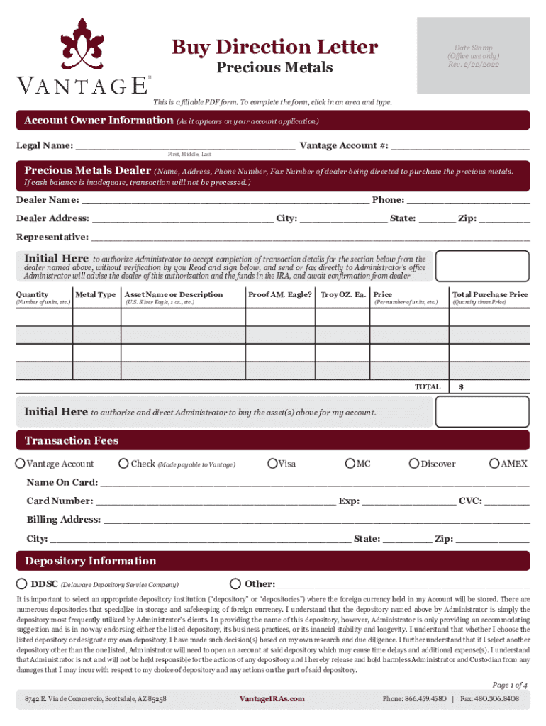 This document serves as a formal directive from the account owner to instruct the administrator to purchase precious metals on their behalf, including account information, dealer details, transaction