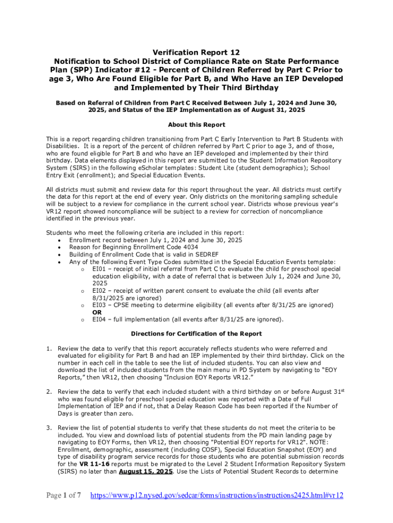 The Verification Report 12 Form is a critical document used primarily in compliance and educational reporting within school districts, particularly concerning special education services and programs. This form ensures that districts accurately report data related to children with disabilities, including those eligible under Part B and Part C of the Individuals with Disabilities Education Act (IDEA).