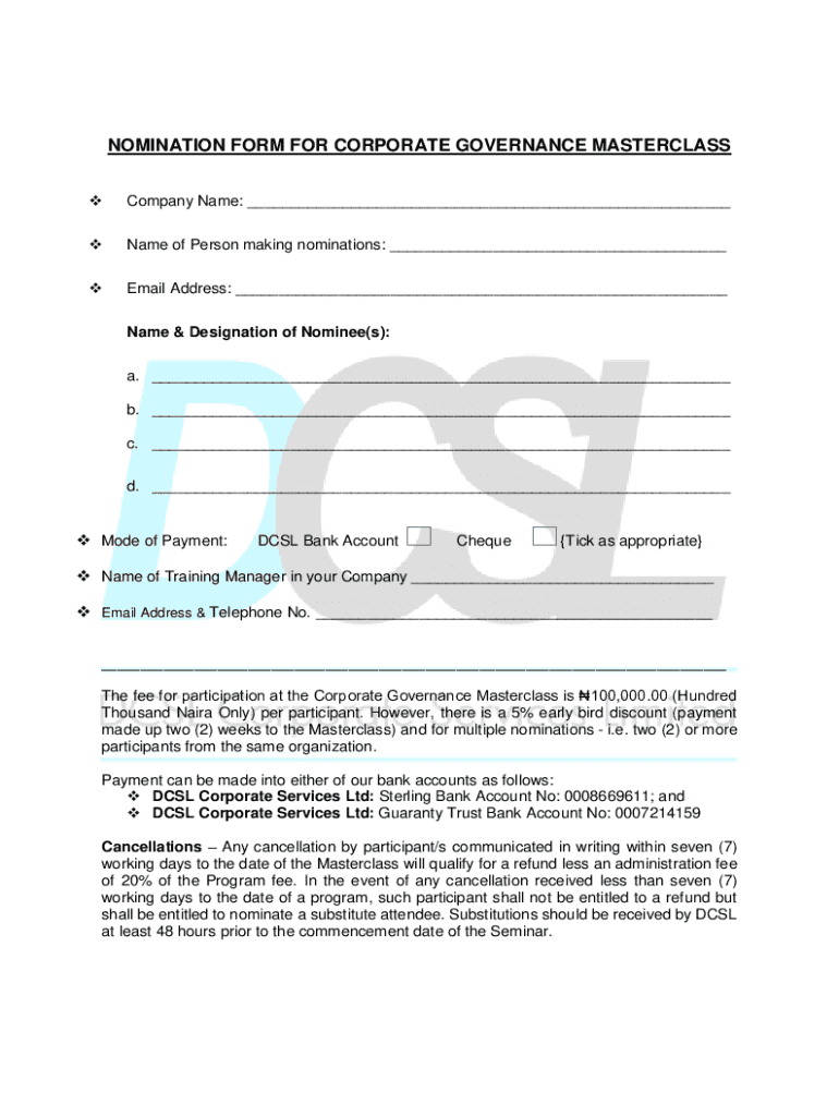 Get the free Nomination Form for Corporate Governance Masterclass