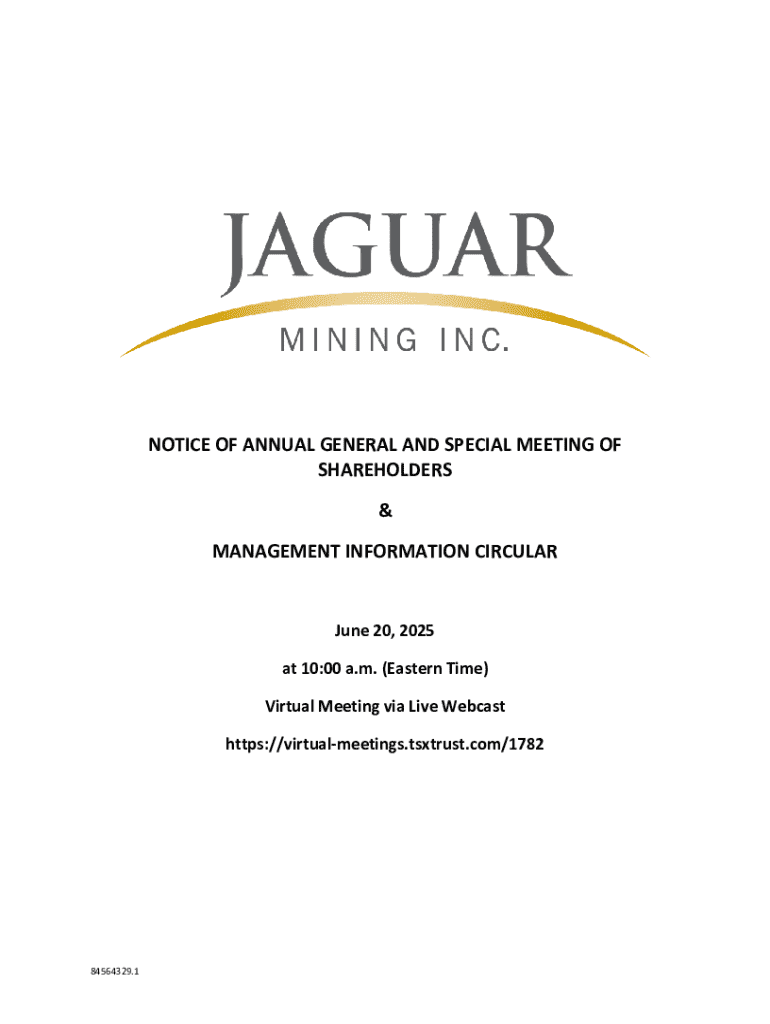 This document serves as a notice for the annual general and special meeting of shareholders for Jaguar Mining Inc., detailing the agenda, voting procedures, proxy information, and other relevant details