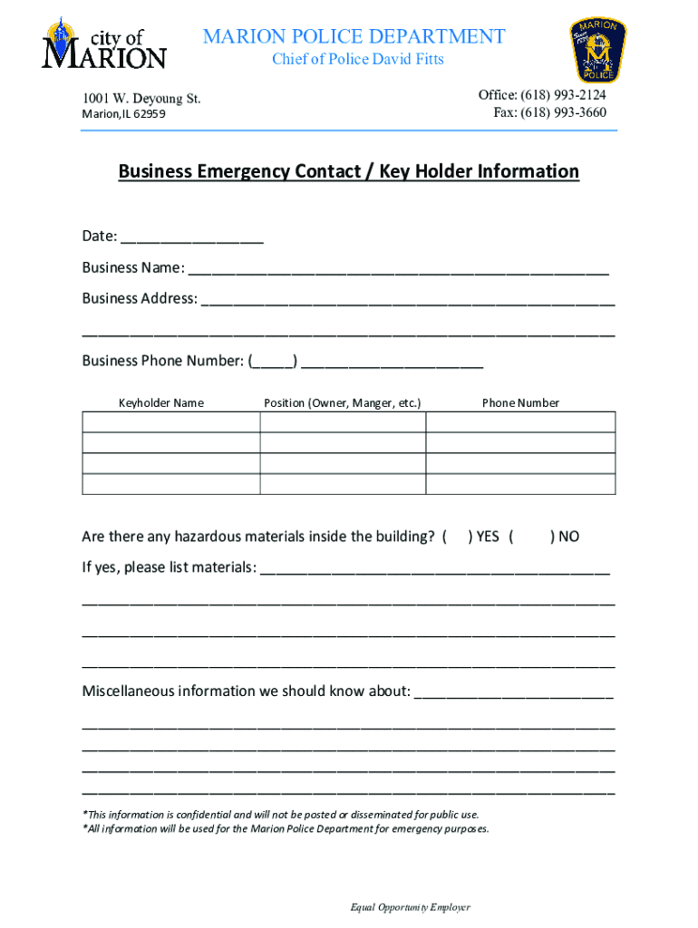 Get the free Business Emergency Contact / Key Holder Information