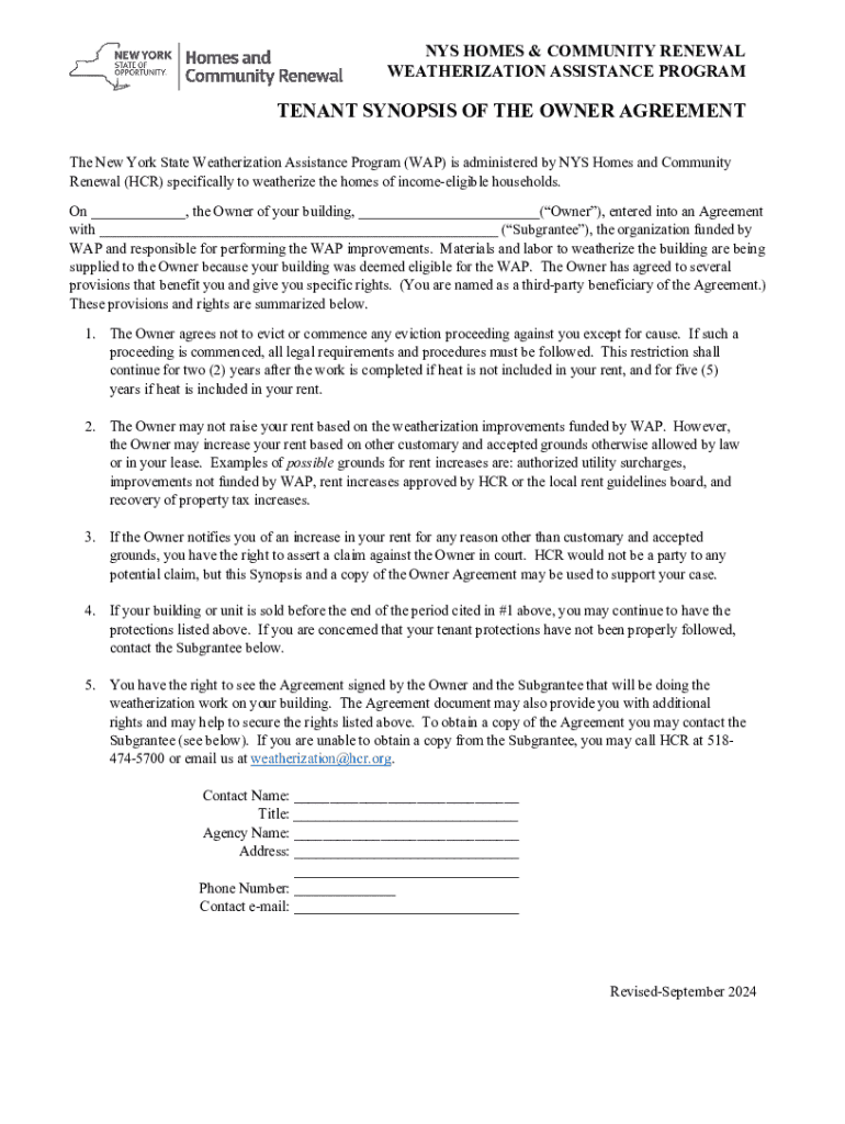 Get the free Nys Homes & Community Renewal Weatherization Assistance Program Tenant Synopsis of t...