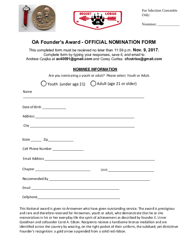 Get the free Oa Founder's Award - Official Nomination Form