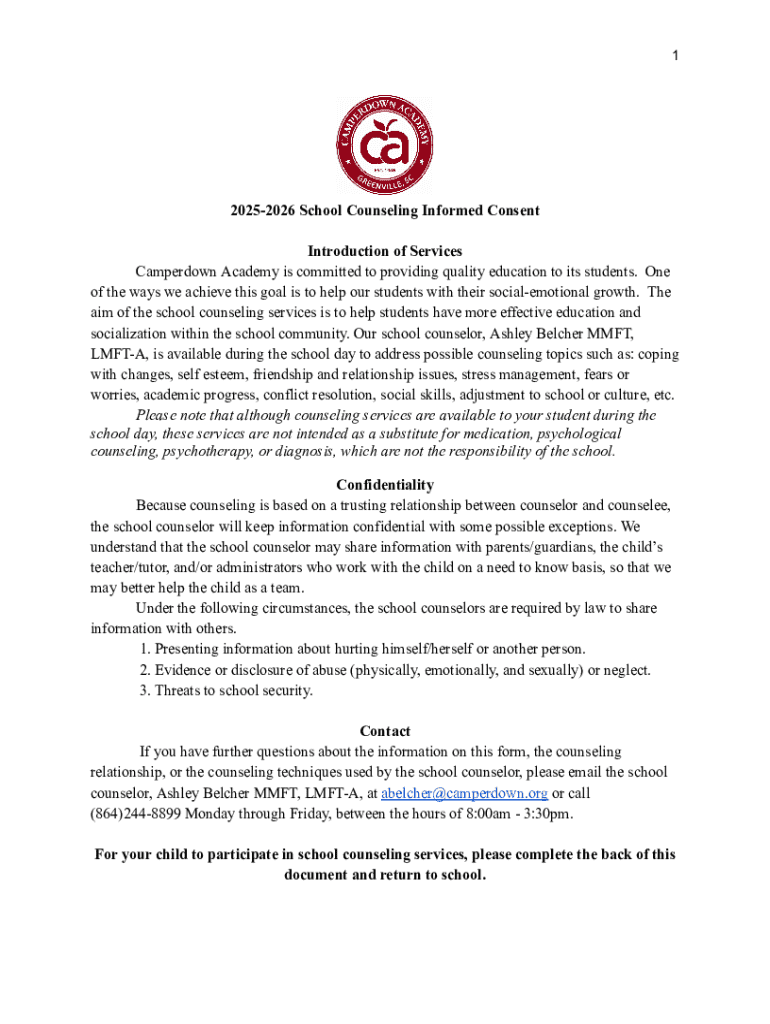 Next, you will indicate your consent to participate in the counseling services, explicitly acknowledging the information presented regarding confidentiality and the therapist's role. Misunderstandings arise when parents or students overlook these details, so it’s essential to take your time in this section.