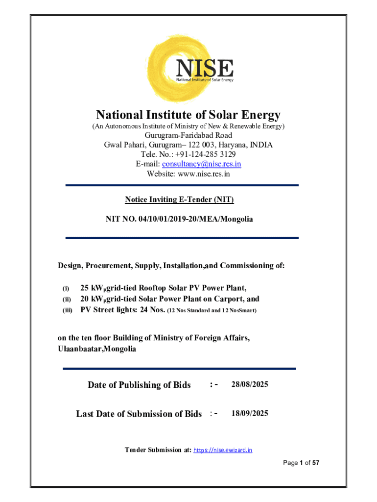This document is a Notice Inviting ETender for the design, procurement, supply, installation, and commissioning of solar power plants and street lights for the Ministry of Foreign Affairs in Ulaanbaatar,