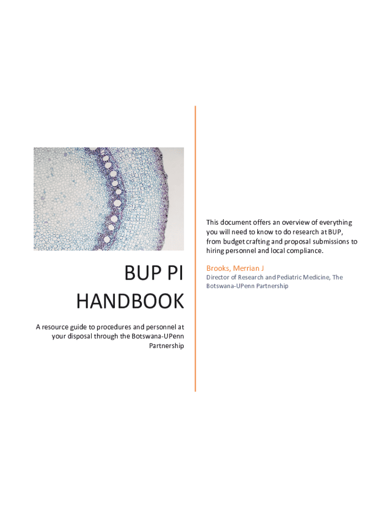 A resource guide to procedures and personnel at your disposal through the BotswanaUPenn Partnership, covering research processes from budget crafting to compliance.