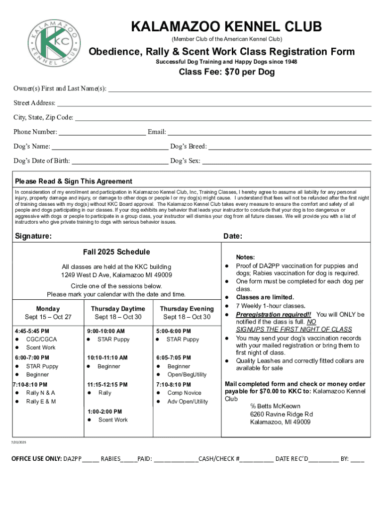 Get the free Obedience, Rally & Scent Work Class Registration Form