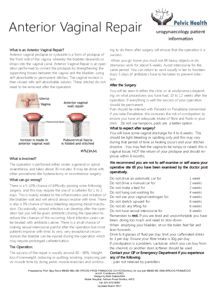 This document provides information regarding anterior vaginal prolapse, the repair procedure, postoperative care, potential risks, and what patients should expect after surgery.