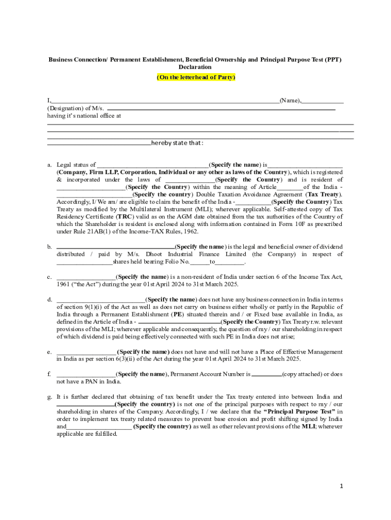 Get the free Business Connection/ Permanent Establishment, Beneficial Ownership and Principal Pur...