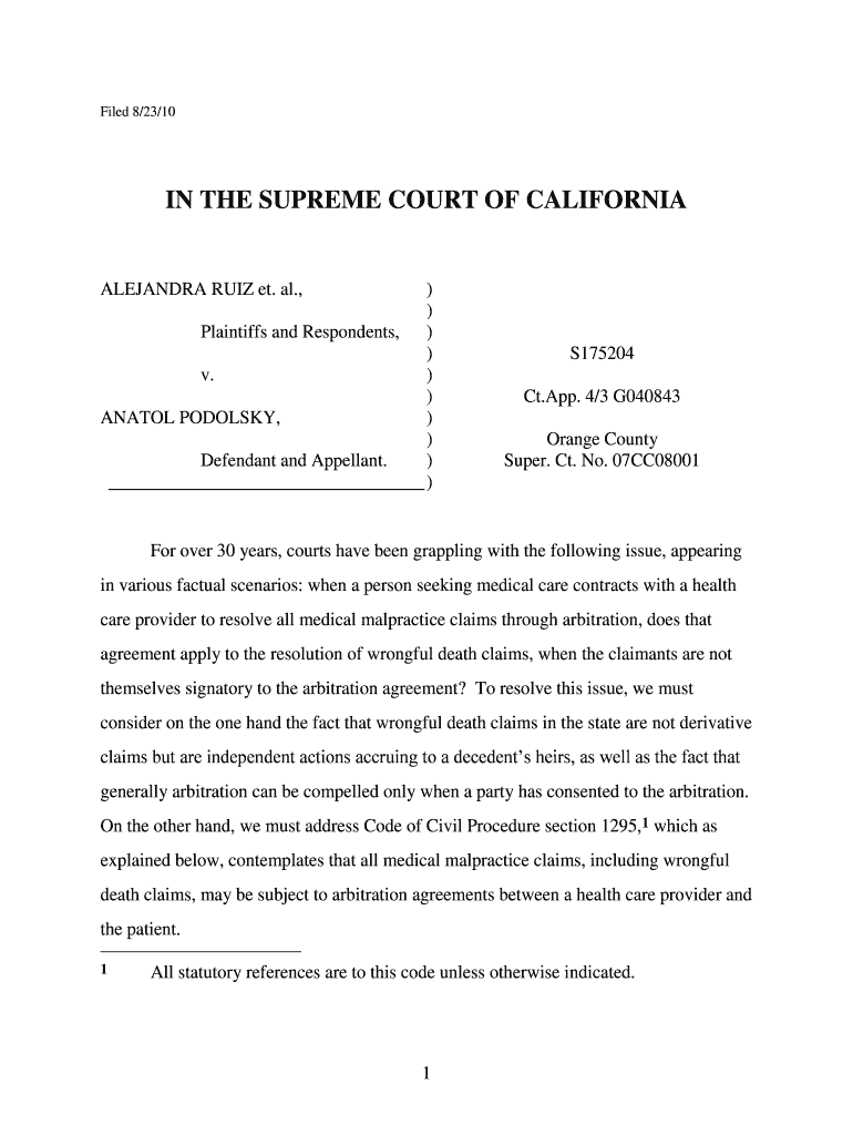Filed 8/23/10 IN THE SUPREME COURT OF CALIFORNIA ALEJANDRA RUIZ et al.,) ) Plaintiffs and Respondents,) ) v.) ) ANATOLE POOLS,) ) Defendant and Appellant. )) S175204 Ct. App. 4/3 G040843 Orange County