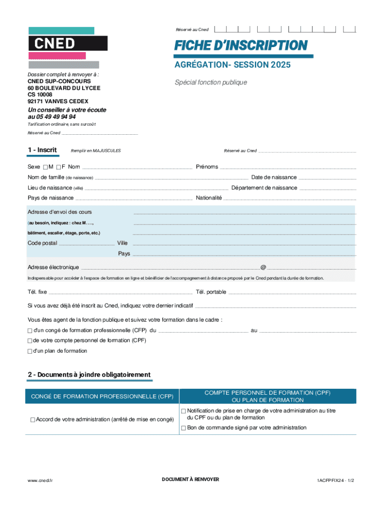 Ce document est une fiche dinscription pour participer l\'agrgation de session 2025, incluant des informations ncessaires pour le traitement d\'inscription et des documents requis.