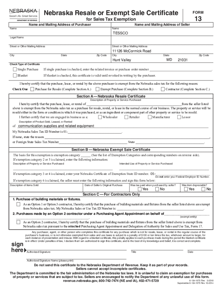 Get the free Nebraska Resale or Exempt Sale Certificate