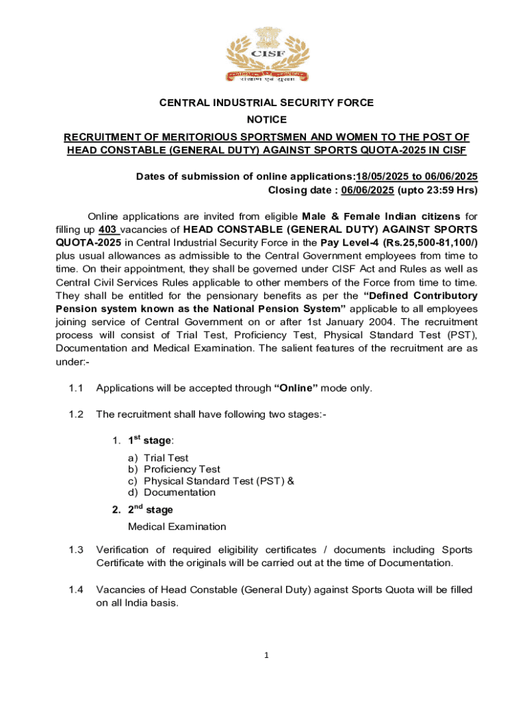 This document serves as a notice for the recruitment of Meritorious Sportsmen and Women for the position of Head Constable (General Duty) in the CISF against the Sports Quota for the year 2025, outlining