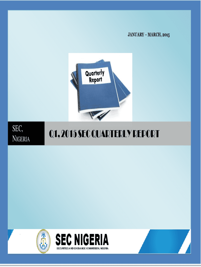 JANUARY MARCH, 2015SEC, NIGERIAQ1, 2015 SEC QUARTERLY REPORT2TABLE OF CONTENTS PAGECONTENTS3PRIMARY AND SECONDARY MARKETS17SECURITIES AND INVESTMENTS SERVICES23ENFORCEMENT26REGISTRATION AND EXCHANGES30MONITORING33FINANCIAL