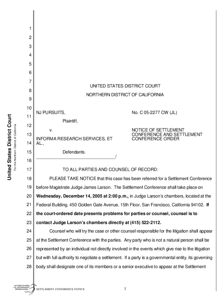 Get the free Notice of Settlement Conference and Settlement Conference Order