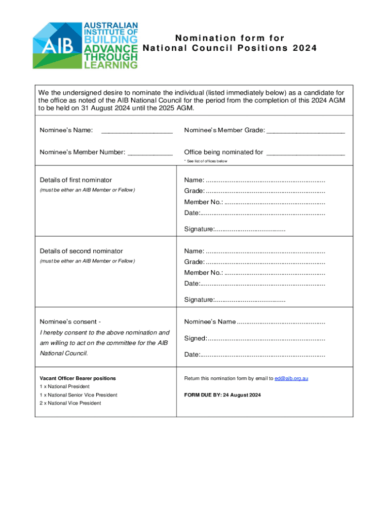 Get the free Nomination Form for National Council Positions 2024 - aib org