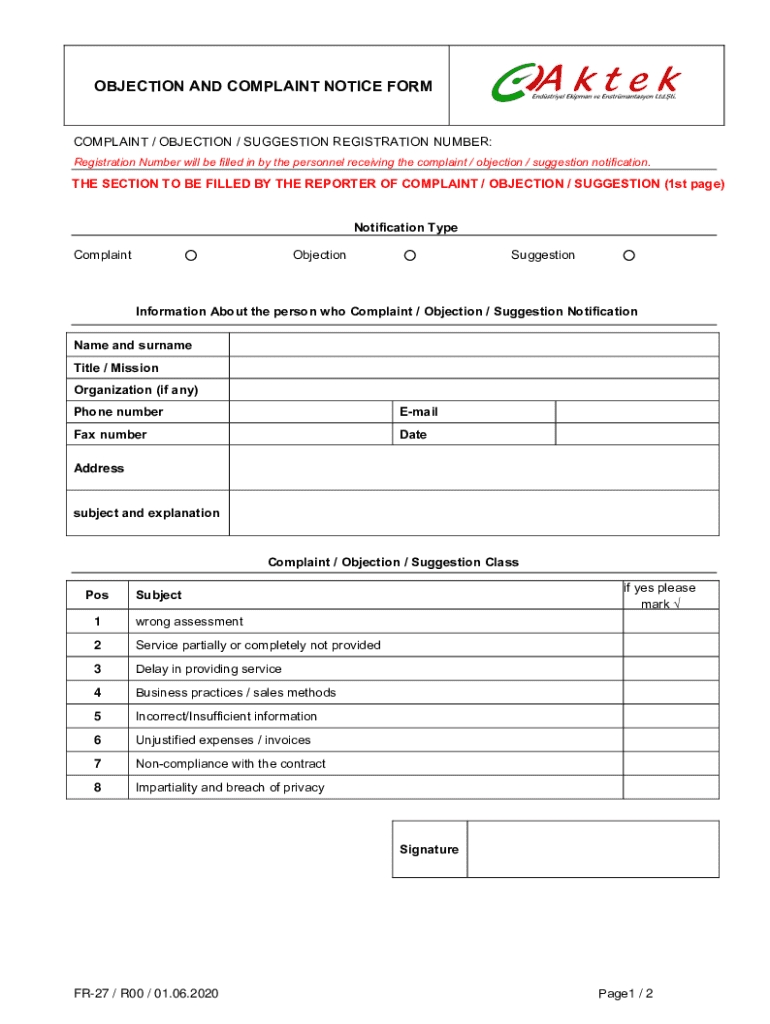 Get the free Objection and Complaint Notice Form