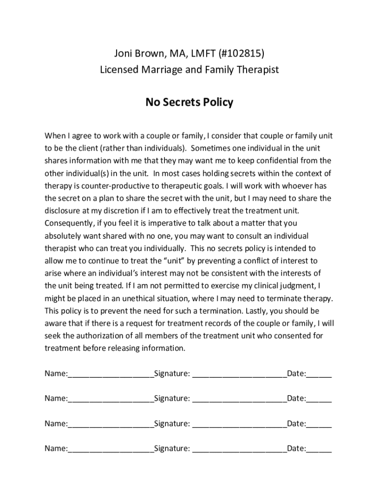 This document outlines the No Secrets Policy for therapy with couples or families, emphasizing the importance of shared information and the treatment of the unit over individual confidentiality.
