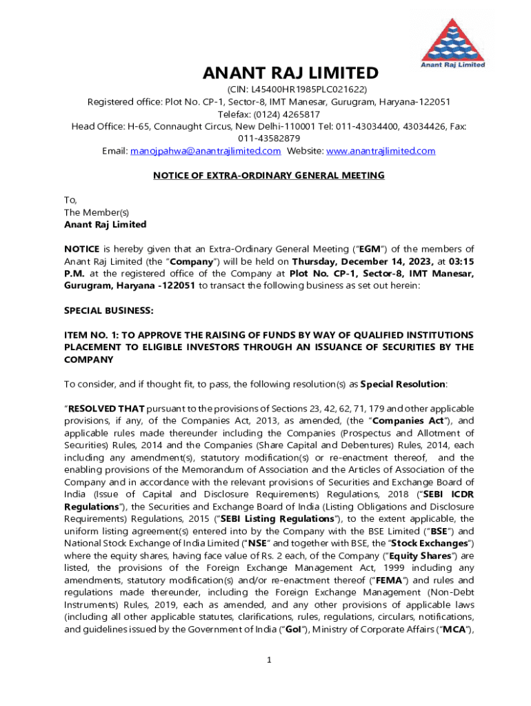 This document serves as a notice for the ExtraOrdinary General Meeting of Anant Raj Limited, detailing the date, time, venue, and special resolutions to be discussed and voted upon, specifically regarding
