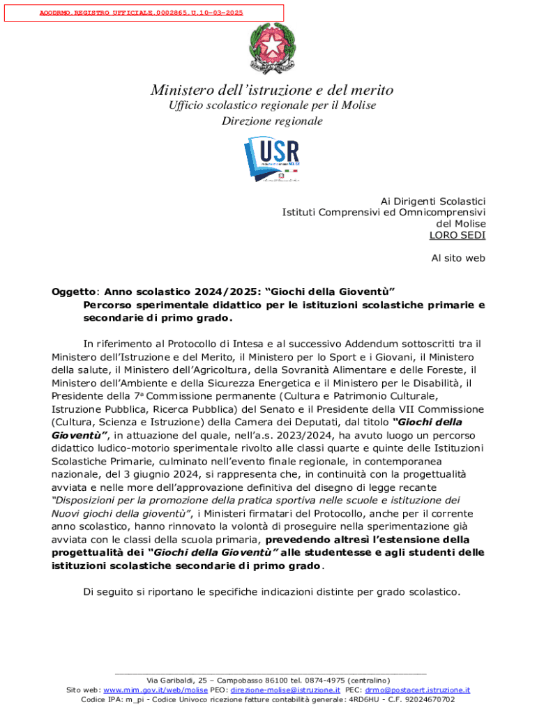 Documento ufficiale relativo ai Giochi della Giovent per l\'anno scolastico 2024/2025, che include dettagli sulle attivit sportive per le scuole primarie e secondarie di primo grado in Molise.