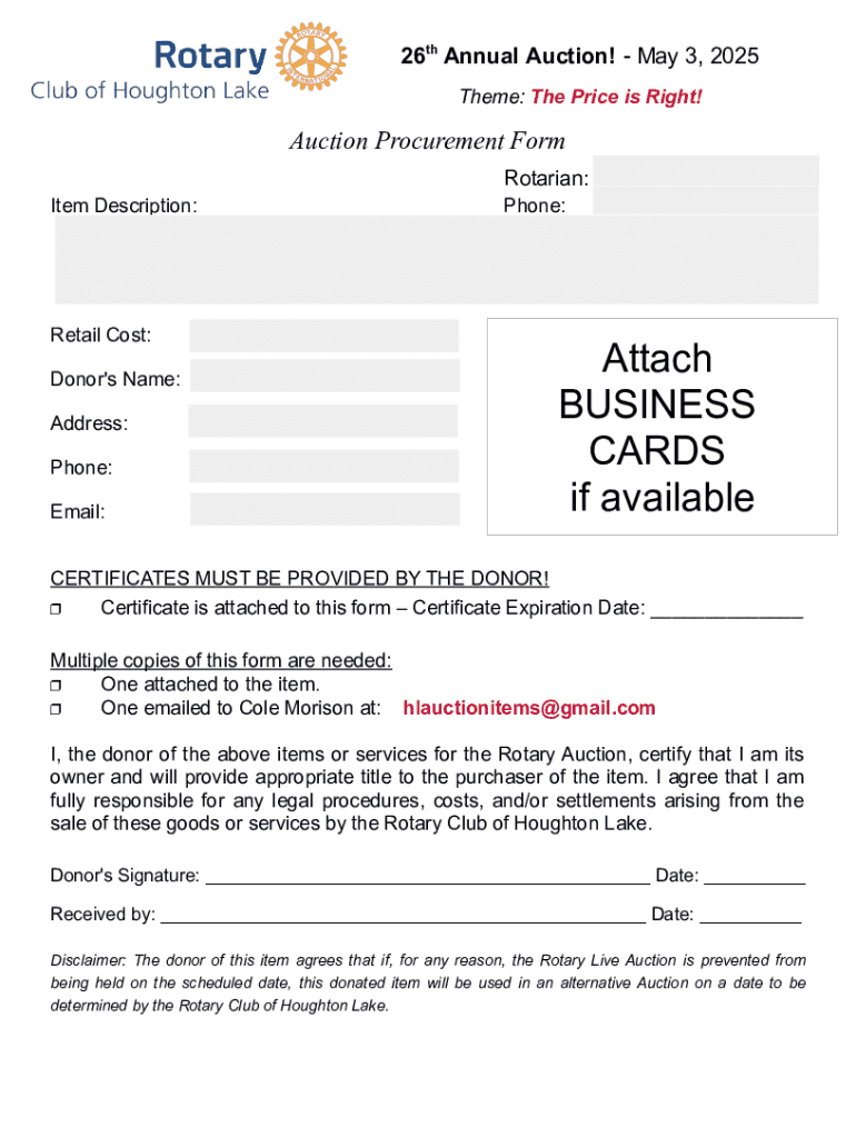 This document serves as a procurement form for donors participating in the 26th Annual Auction organized by the Rotary Club of Houghton Lake.