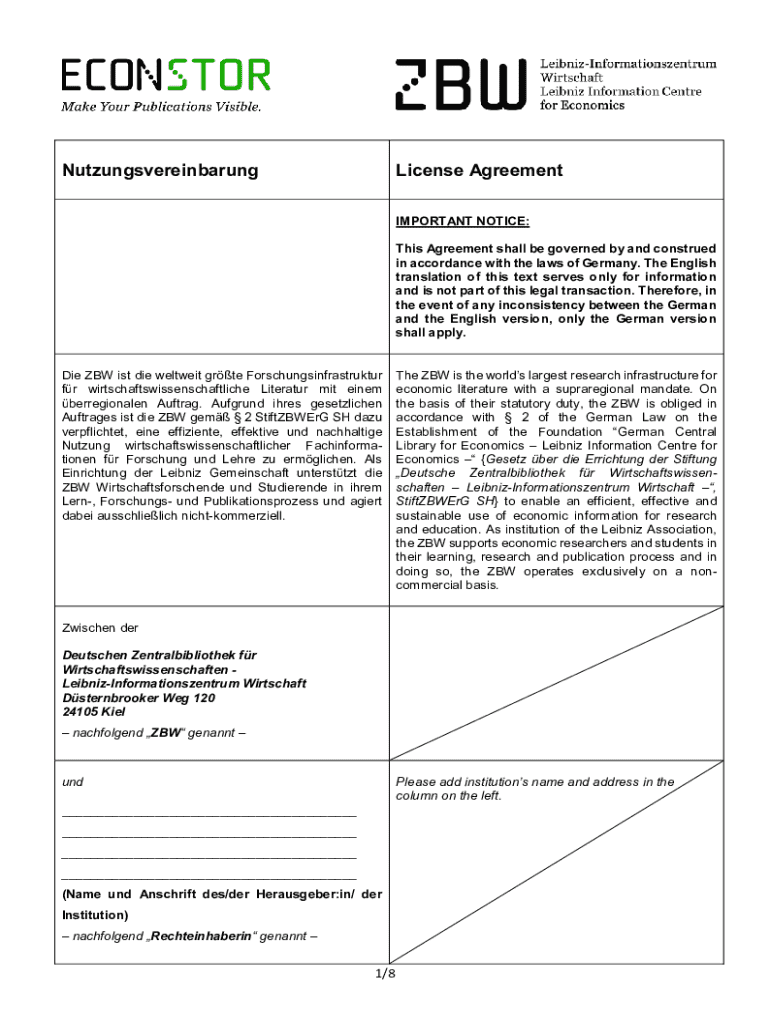 Die Nutzungsvereinbarung regelt die Bedingungen fr die Nutzung von wirtschaftswissenschaftlicher Literatur durch die ZBW und die Rechteinhaber. Sie beinhaltet Informationen ber die Verffentlichung,