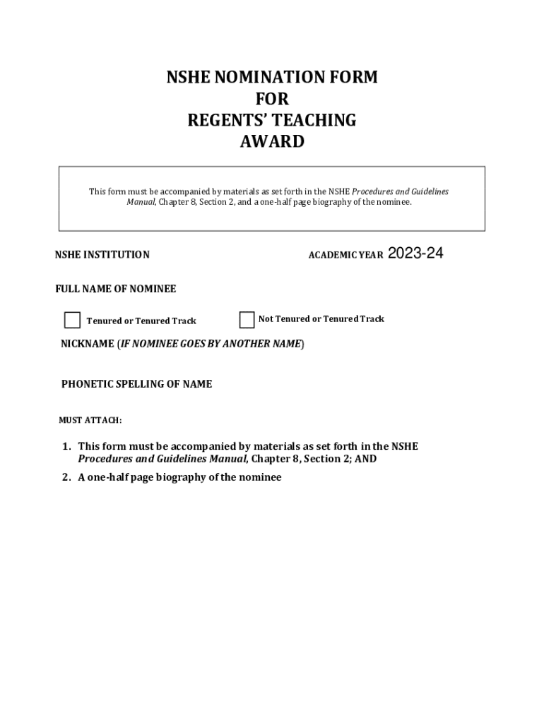 This form is used for nominating individuals for the Regents\' Teaching Award, requiring specific accompanying materials as per the NSHE Procedures and Guidelines.