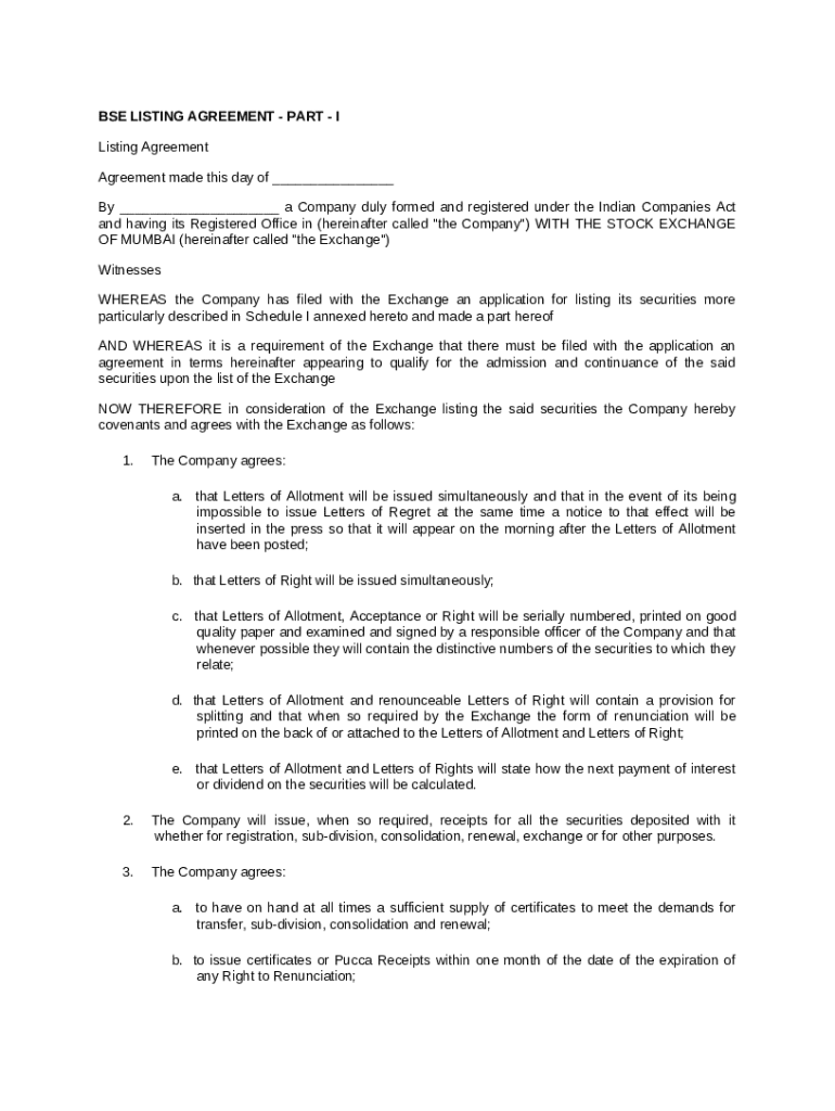 The Bse Listing Agreement - Part - I is a writable document you can get completed and signed for certain needs. Then, it is provided to the actual addressee in order to provide some info and data. The completion and signing is available in hard copy by hand or using an appropriate tool e. g. PDFfiller. Such applications help to complete any PDF or Word file without printing them out. While doing that, you can edit it according to your needs and put an official legal e-signature. Once done, you send the Bse Listing Agreement - Part - I to the respective recipient or several of them by email and also fax. PDFfiller provides a feature and options that make your blank printable. It includes various options when printing out. No matter, how you send a document - physically or electronically - it will always look professional and clear. In order not to create a new editable template from the beginning over and over, make the original document as a template. Later, you will have a rewritable sample.