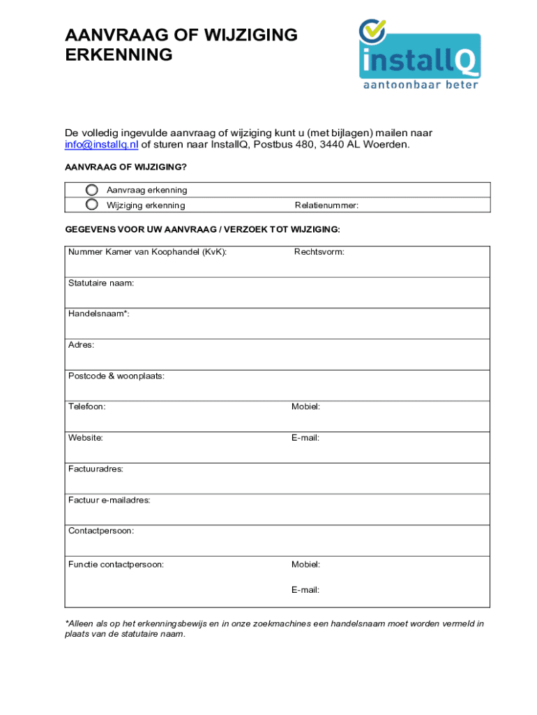 Dit document is bedoeld voor het indienen van een aanvraag of wijziging voor erkenning, inclusief de benodigde gegevens en bijlagen.