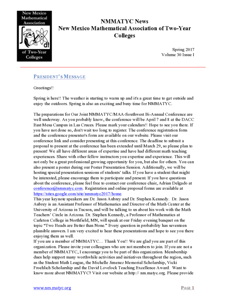 This document serves as a newsletter for the New Mexico Mathematical Association of TwoYear Colleges, providing updates on events, conferences, and educational initiatives relevant to mathematics