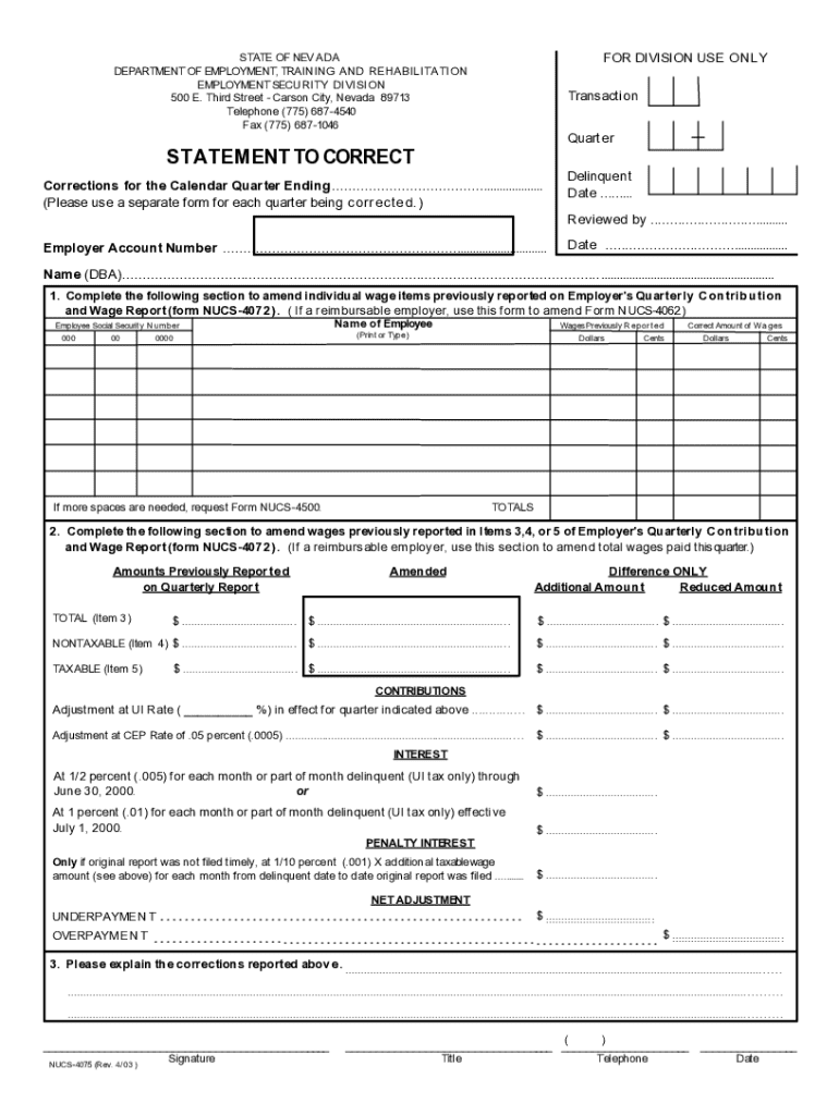 The Nucs-4075 form is particularly important for tracking employer and employee data, allowing for the timely and accurate submission of wage reports and contributions. It contains specific sections that require detailed information about employee wages, penalties, and adjustments for each calendar quarter. This ensures that all reports are up-to-date and compliant with state laws, which can help avoid penalties for late or inaccurate reporting.