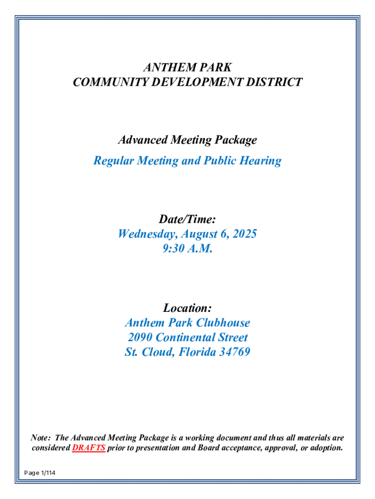 This document serves as the advanced meeting package for the Anthem Park Community Development District, detailing the agenda, location, time, and relevant documents for the board\'s upcoming meeting.