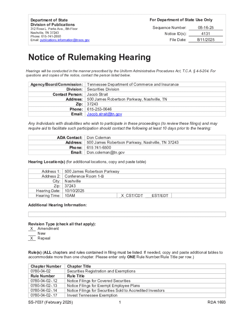 A well-structured notice of rulemaking hearing form consists of several essential components that ensure clarity and facilitate public participation. The header information includes the title of the rule, the agency responsible, and the docket number, which references the specific rulemaking process.