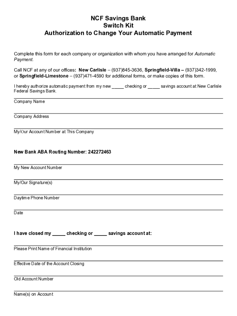 Before diving into the NCF Savings Bank Switch Form, it’s crucial to prepare essential information to ensure you fill it out accurately. This information typically includes your personal identification details, current account information, and options for your new account preferences. Gather your identification documents, such as a government-issued ID, and have your current bank account details ready as they will be necessary for your application.
