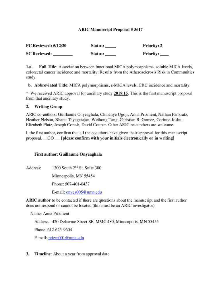 The ARIC Manuscript Proposal 3617 is a standardized document used for submitting research proposals related to the ARIC (Atherosclerosis Risk in Communities) study, specifically focusing on various health outcomes and interventions.
