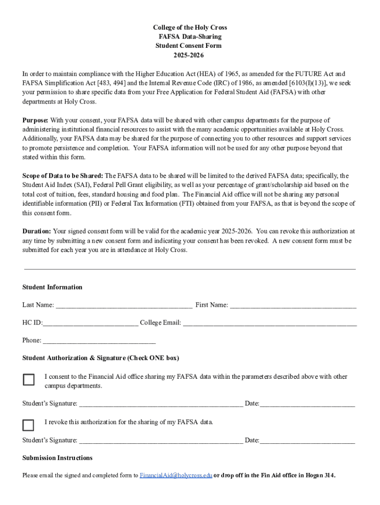The FAFSA Data-Sharing Student Consent Form is a critical component for students applying for financial aid in the United States. It serves to authorize the sharing of students' financial and educational data among various educational institutions and federal agencies. This consent is vital as it ensures that eligible students receive the financial assistance needed for their education while complying with the Family Educational Rights and Privacy Act (FERPA). By understanding this form, students can navigate their financial aid opportunities more effectively.