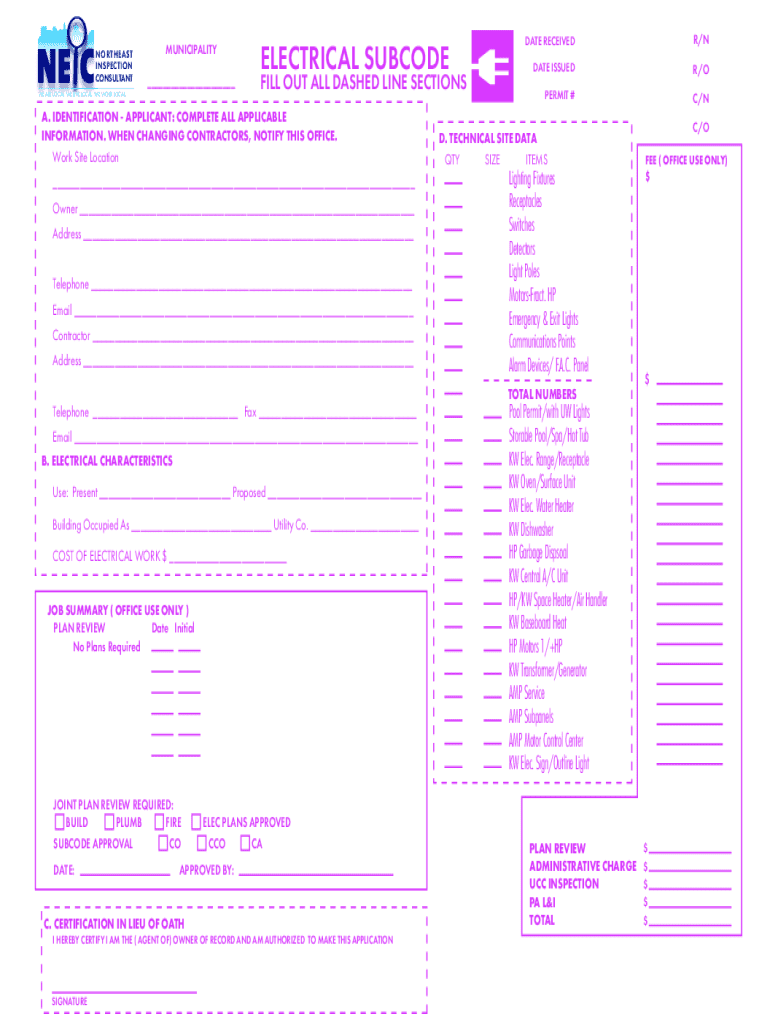 This document is used to submit an application for electrical work under the municipality\'s electrical subcode, providing necessary details about the applicant, work site, electrical characteristics,