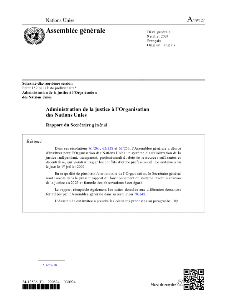 Ce rapport prsente un compte rendu du fonctionnement du systme d\'administration de la justice l\'ONU pour l\'anne 2023, en se fondant sur les rsolutions prcdentes et les statistiques des affaires